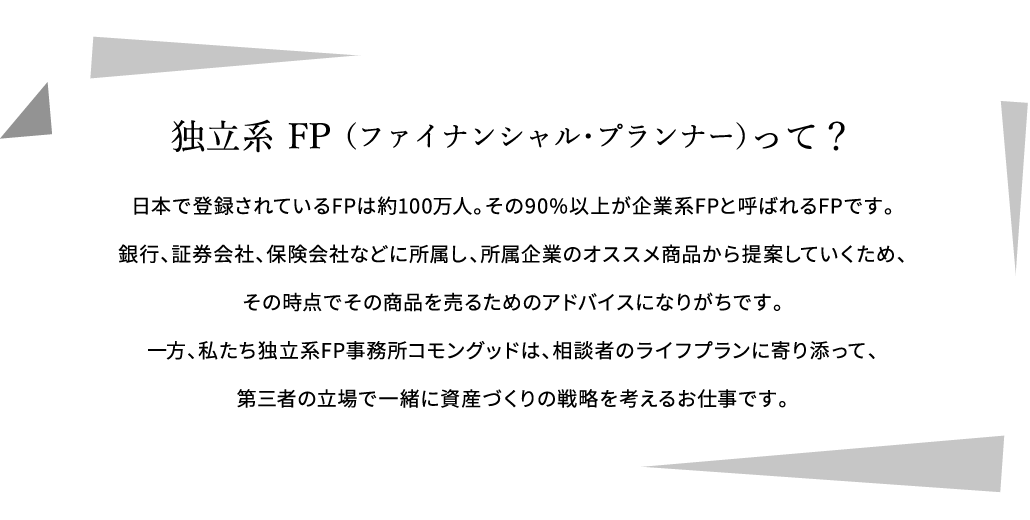 一方、私たち独立系FP事務所コモングッドは、相談者のライフプランに寄り添って、第三者の立場で一緒に資産づくりの戦略を考えるお仕事です。